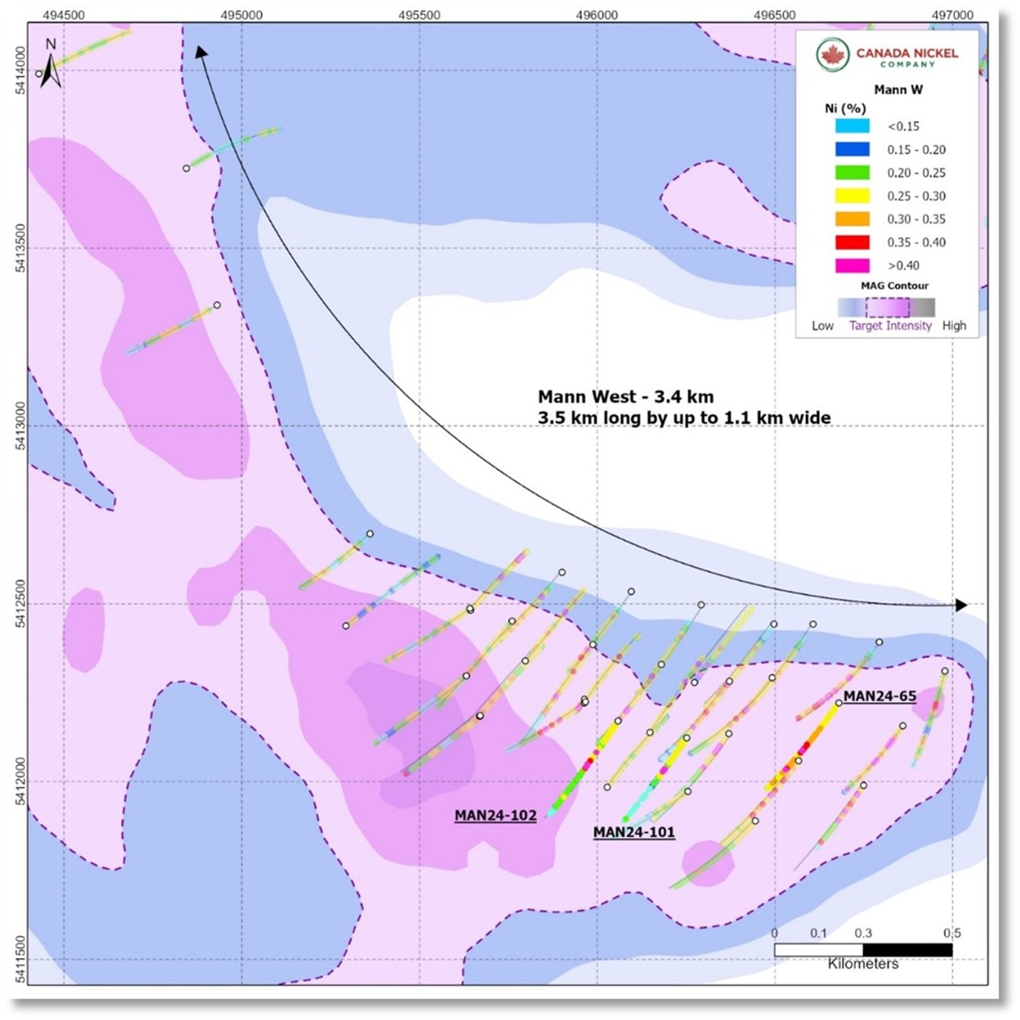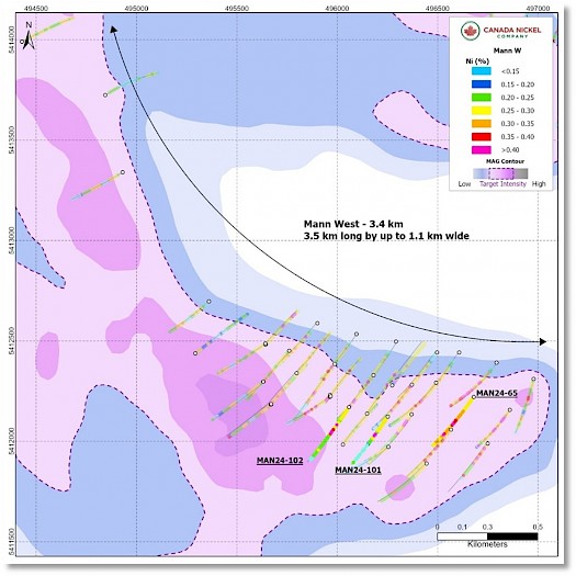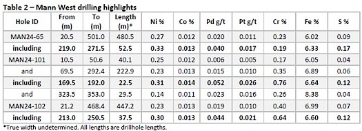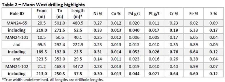 Mann West is approximately 3.5 kilometres long by up to 1.1 kilometres wide (covering 3.4 square kilometres). Drilling focused on the southern half of the target and is now completed over a strike length of 1.7 kilometres and a width of at least 600 metres. The most recent drilling intersected long sections of well-serpentinized peridotite and minor dunite with disseminated and visible nickel sulphide mineralization consisting primarily of pentlandite and heazlewoodite. The Company has drilled a total of 39 holes at Mann West, 31 of which were drilled during the 2024 campaign (Figure 2). The company is currently working on an initial resource estimate expected in June 2025. Assays from the last three holes are presented in this release (Table 2).